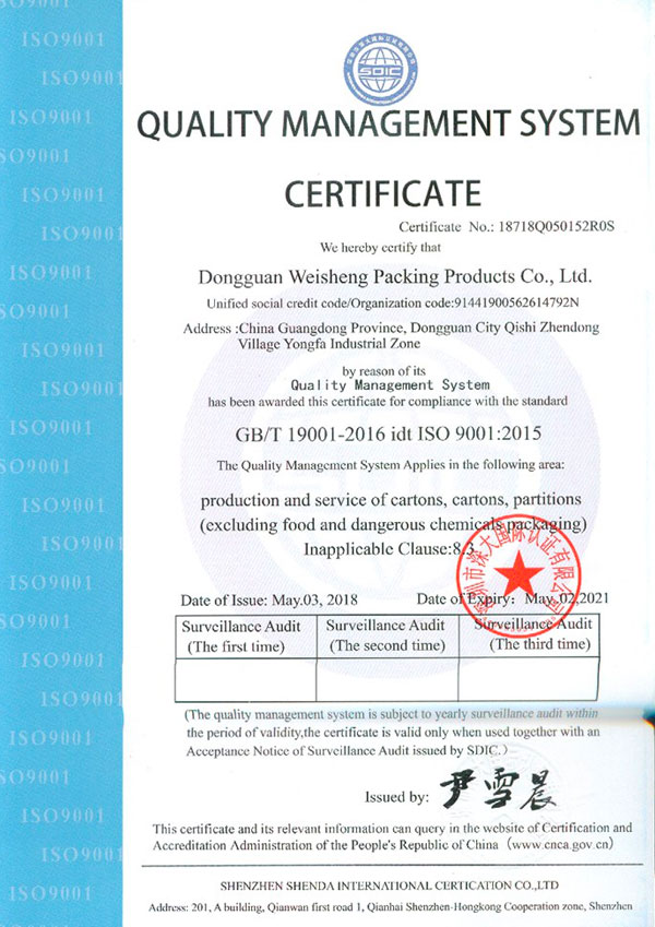 东莞市伟盛包装制品有限公司成立于2010年,已通过ISO9001质量体系和ISO14001环境体系认证,公司占地面积5000平方米,十几年的发展,公司一直致力于纸箱、纸盒、啤盒、彩盒、飞机盒等纸制品,广泛应用于电子,家私、工艺品、灯饰、五金、塑胶等产品的包装上,欢迎新老客户致电垂询。